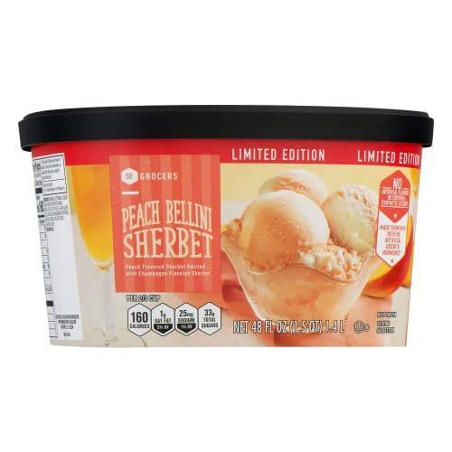 Southeastern Grocers has just launched SE Grocers-brand Peach Bellini sherbet, which combines peach-flavored sherbet and swirls of champagne-flavored sherbet. Plus, Target sells Good & Gather Peach Bellini-flavored sparkling water.