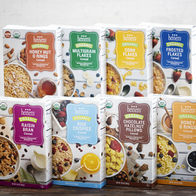-Heinen’s organic, gluten-free cereal comes in several varieties, including Multigrain Flakes, Raisin Bran; and toasty Honey O Rings.